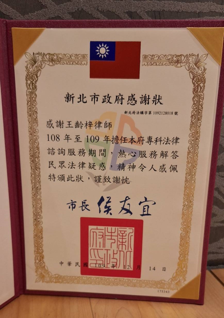 108、109年擔任新北市政府專科法律諮詢律師獲頒感謝狀